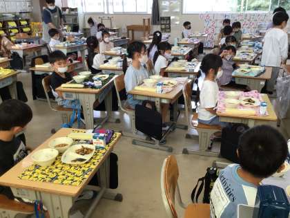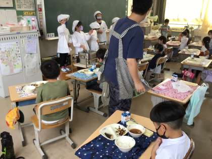1の1 給食の配膳中。 1年生も整然と配膳できています。 すばらしい!