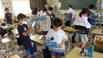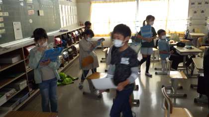 3の2 図工です。 友達の作品の良さを教えよう。 机の上の作品をみて、回っています。