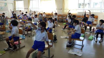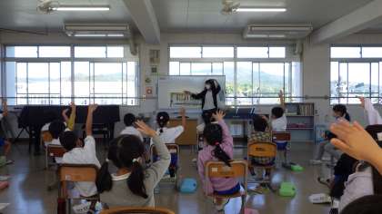 ドレミの音の高さを手で表現しています。