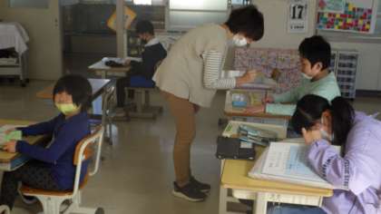 10月19日 その1 公開日 2022/10/19 更新日 2022/10/19 校長室から やまもも学級です。 1組教室では、道徳の話し合いです。 2組教室では、国語の勉強中です。 校長 特別支援学級