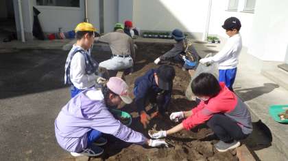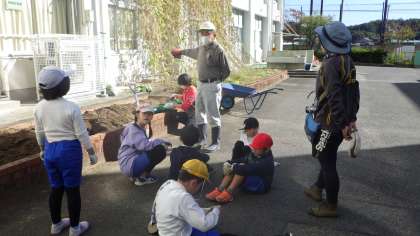 河田さんから、さと芋の傘のような葉っぱが大きければ大きいほど大きな芋になるよって教えてもらいました。