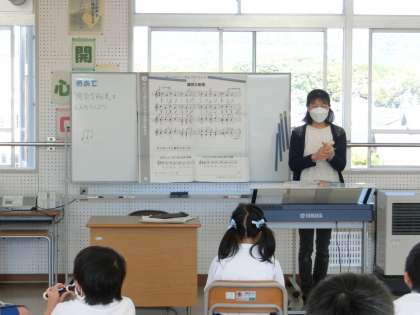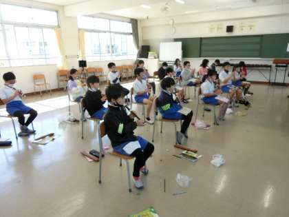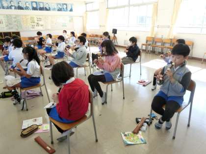 10月26日 その6 公開日 2022/10/26 更新日 2022/10/26 校長室から 4の1 音楽です。 「陽気な船長」 リコーで演奏しよう。 「タンギング」 トゥ トゥ トゥ トゥ をうまく吹く練習です。 校長 4年