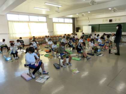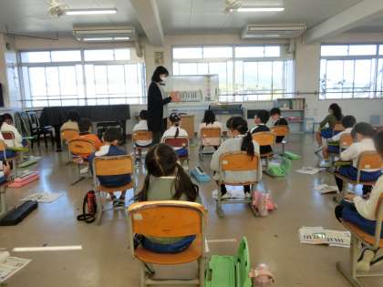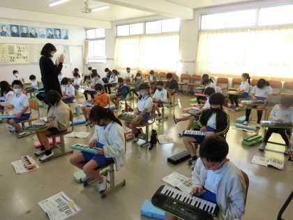 10月28日 その5 公開日 2022/10/28 更新日 2022/10/28 校長室から 1の1 音楽です。 「なかよし」をリコーダーで演奏しよう。 鍵盤を押さえる指に気を付けようね。 校長 1年 特別支援学級
