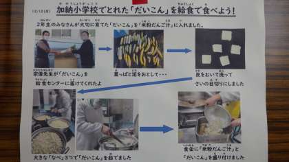 12月12日 その1 公開日 2022/12/12 更新日 2022/12/12 校長室から 2年生が育てた大根を米粉だんご汁に入れてくれたよ。 さいの目ぎりにしてくれたよ。 おいしかったよ。 給食センターの方が来校されました。 大根を調理くださり、ありがとうございます。 校長 2年