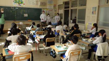 給食の時に、北給食センターの皆さんが見に来てくれたよ。