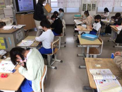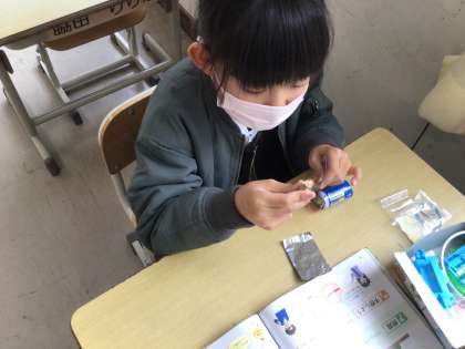 12月13日 その4 公開日 2022/12/13 更新日 2022/12/13 校長室から 3の1 理科です。 電気を通すのはどんな物だろう? 回路にいろいろな物をつなげて電気を通すか試します。 まずは、鉄の釘です。 豆電球が光ったのを見て、 「点いた! 燃えてる!」 校長 3年