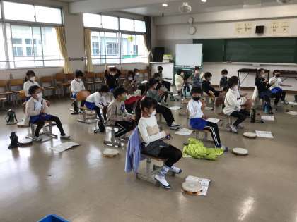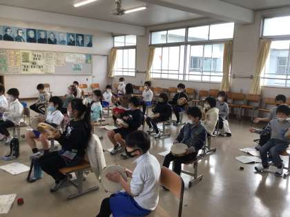 カスタネットとタンブリンで、リズム打ちです。