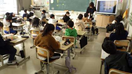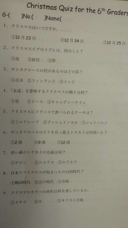 12月21日 その3 公開日 2022/12/21 更新日 2022/12/21 校長室から 6の1 英語です。 クリスマスについてのクイズに挑戦中です。 途中から、難しいくなってきます。 皆さんも挑戦してみてはいかがですか? 校長 6年