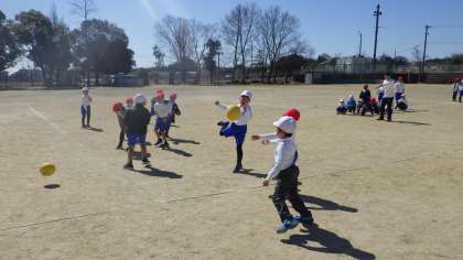 枠は一つ。枠の中の子は、外の子が投げてボールをゲット(当たってもいい、とにかくボールを持つ)したら、1点。