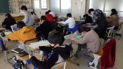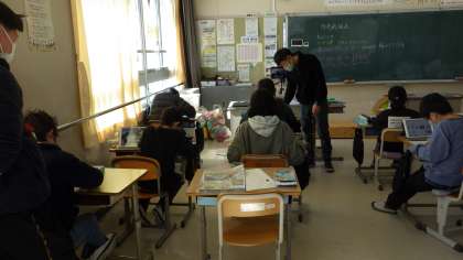 3月3日 その5 公開日 2023/03/03 更新日 2023/03/03 校長室から 5の1 図工です。 多色刷版画 「掘ったところが黒くなる」 いったいどういうことかな? 黒い紙に版を押すんだ。 校長 5年 特別支援学級