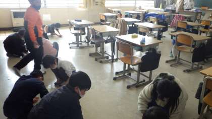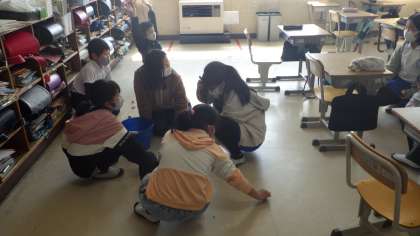 5年生 床磨きをしています。 1年間使った教室の床。 きれいにして引き渡します。
