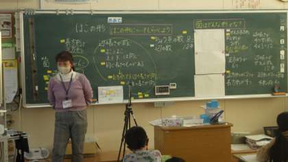 3月15日 その2 公開日 2023/03/15 更新日 2023/03/15 校長室から 2の1 算数です。 箱の形について調べよう 頂点の数はいくつ? へんの数はいくつ? 面の形はどうなっている? 校長 2年