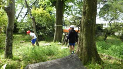 やまももタイムの林の中 「「カエル2匹捕まえたよ」 「トカゲもいたよ」 生きものみつけたね。