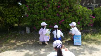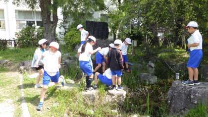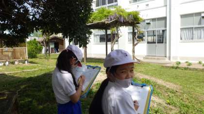 3の2 理科です。 春の生き物観察だよ。 花の観察や池の生き物探しをしたよ。