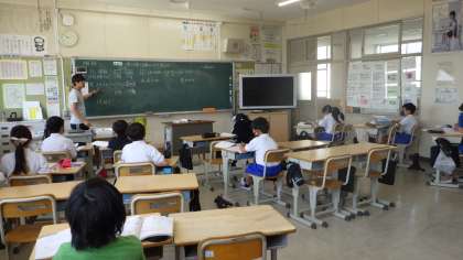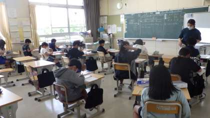 5月17日 その1 公開日 2023/05/18 更新日 2023/05/18 校長室から 5年生 算数です。 少人数です。 小数×小数のの計算の仕方の勉強です。 1Lの砂の重さは1.8kg。この砂0.3Lの重さは? 1.8 × 0.3 =0.54 ↓×10 ↓×10 ↑÷100 18 × 3 ==54 なるほどね。 校長 5年 特別支援学級