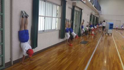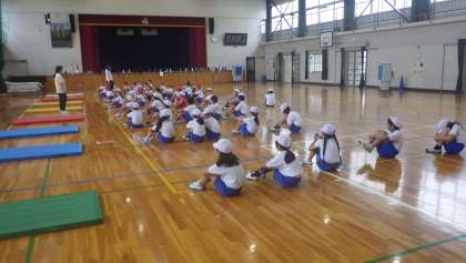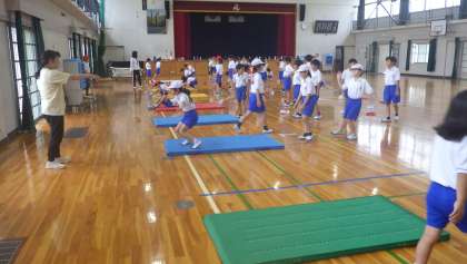 4年生 体育です。 器械運動 マット。 前転のコツを確認しよう!