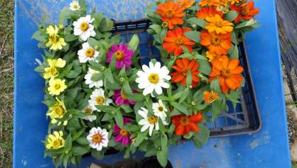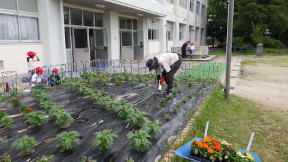 花壇に苗を植えたよ。 公務手の佐々木さんだよ。 ジニア ヒャクニチソウともいうんだね。