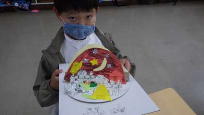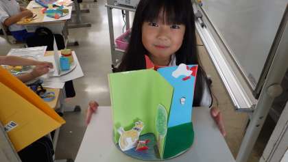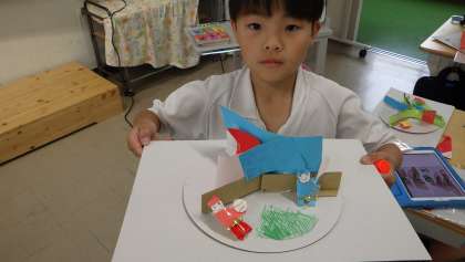 3の1 図工です。 ここも[くるくるランド」作りです。 「みてみて!」 「素敵な作品だね」 「