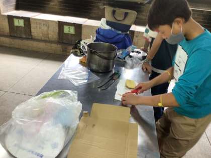 炊事開始。 お米を研いだり、食材を切ったったり。