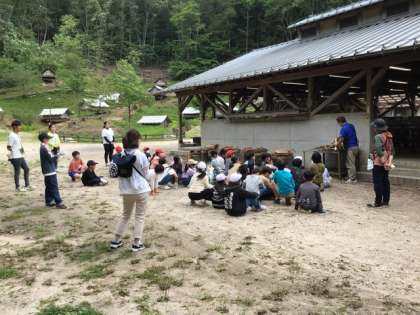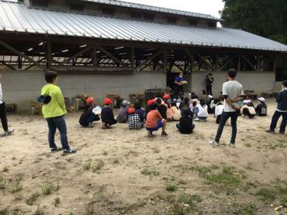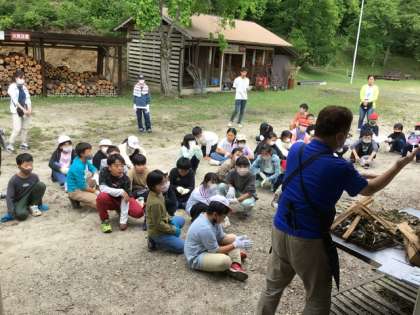 かまどのまき。 どんなふうに組むと火がつきやすい? 熱心に聞いています。