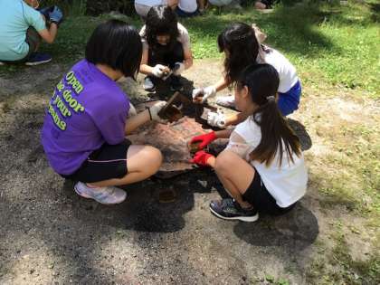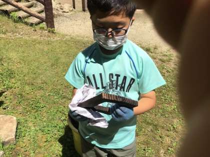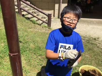 写真立て作りだよ! 表面を焼いたら、たわしと布で表面のすすを落とすよ。