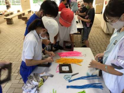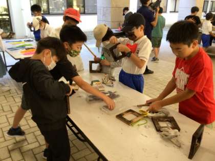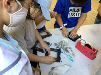 写真立て作り。 ねじ穴を開け、紐を通し、透明のフィルムを取り付けます。