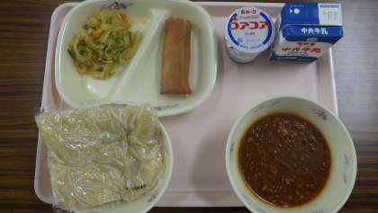 今日の給食。 中華麺を甘味噌につけて食べました。 なんとヨーグルト付き。