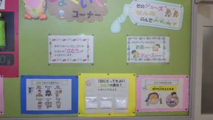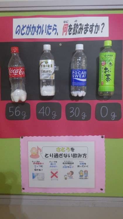 7月10日 その8 公開日 2023/07/11 更新日 2023/07/11 校長室から 栄養教諭の堀田先生が作ってくれたよ。 保健室前の掲示です。 砂糖って、ジュースにこんなに入っているんだね。 ジュースって、一本一気に飲むと砂糖の摂りすぎ? 校長 委員会