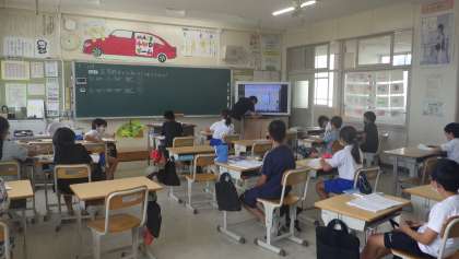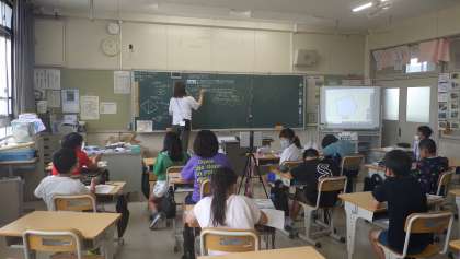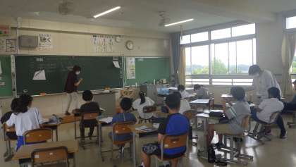 7月19日 その6 公開日 2023/07/19 更新日 2023/07/19 校長室から 5年生 算数です。 少人数指導です。 五角形の内角の和は何度? 五角形を三角形に割ってみよう! 校長 5年 特別支援学級