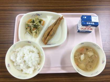 今日の給食です。 ししゃもフライですね。