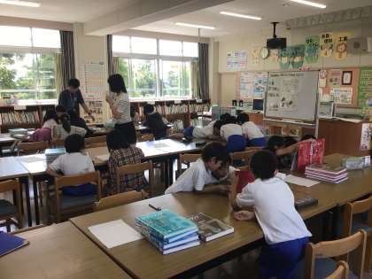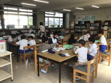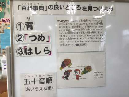 9月27日 その1 公開日 2023/09/27 更新日 2023/09/27 校長室から 3の1 図書館の勉強です。 百科事典使い方。 「背」「つめ」「はしら」 勉強になりました。 いま、アンパンについて調べています。 校長 3年