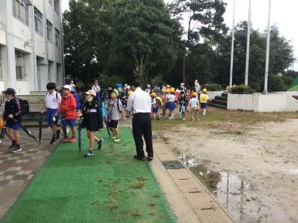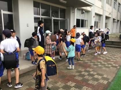 朝の昇降口前。 あいさつ運動の子も多く,にぎやかです。