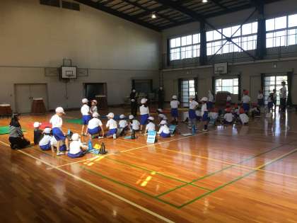 1年生 体育です。 跳び箱遊びです。 跳び箱の上のマットで前回りだよ。