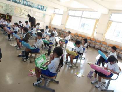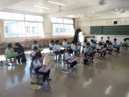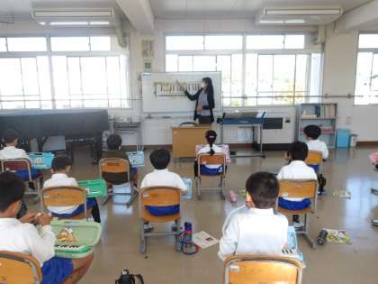 11月1日 その5 公開日 2023/11/01 更新日 2023/11/01 校長室から 1の1 音楽です。 ド ○ ○ ドからソの音を○の中に入れて音を出そう 正しい指使いができるかな。 校長 1年 特別支援学級