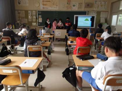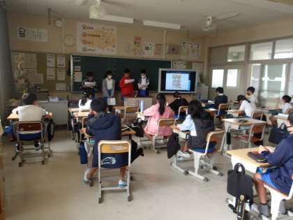 11月6日 その2 公開日 2023/11/06 更新日 2023/11/06 校長室から 6の2 国語です。 自分たちで考えた「町の未来」をプレゼンテーションしよう。 画面も自分たちで作ったんだね。 素晴らしいね。 校長 6年
