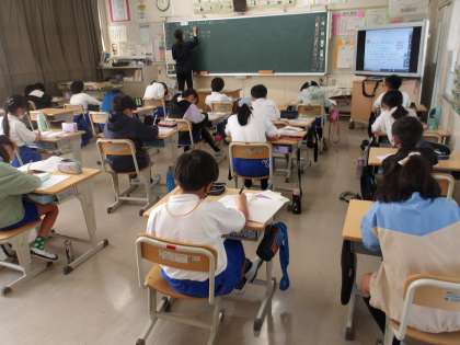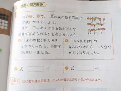 4の1 算数です。 「一束の花の数を□本として、式を書こう」 問題は、下の写真です。