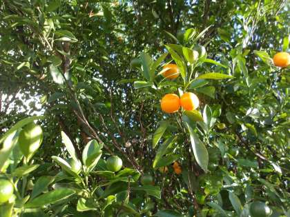 桃の木に並んだ「きんかん」 一つかじってみました。 かなり酸っぱかったです。