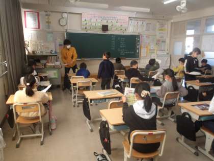 12月1日 その3 公開日 2023/12/01 更新日 2023/12/01 校長室から 4の1 朝の会です。 今日から新しい担任は、校務主任の大口先生です。 午前の4時間の授業は、羽根先生です。 教務主任の宗像先生も体育の授業をします。 先生方、よろしくお願いします。 校長 4年