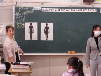 授業研究として、山田先生と養護教諭の松井先生とのティームティーチングです。