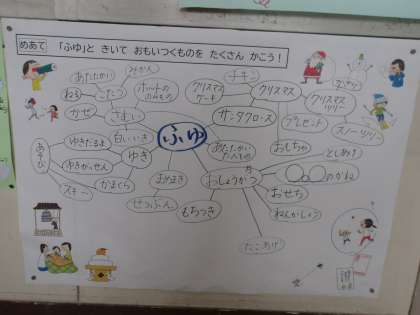 1の2の教室の掲示から。 「ふゆ」のイメージマップだよ。 冬ってなのしいことがいっぱいだね。