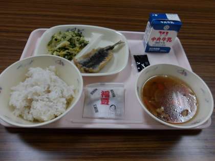 今日の給食です。 節分献立ですね。 「豆」と「イワシのかば焼き」 かば焼きのたれ おいしかったです。