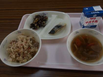 今日の給食です。 味ご飯です。