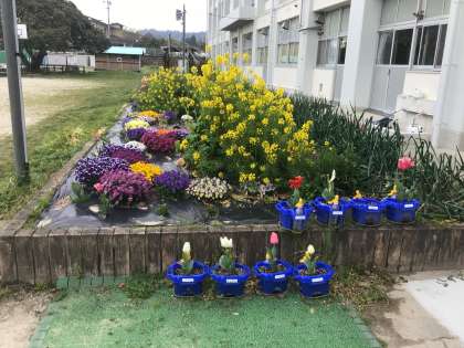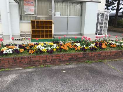 子どもたちの登校前です。 桜はもうすぐ満開ですね! お花たちも,子どもたちが来るのを楽しみしているよ!