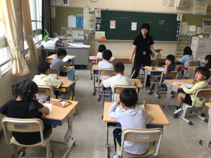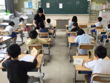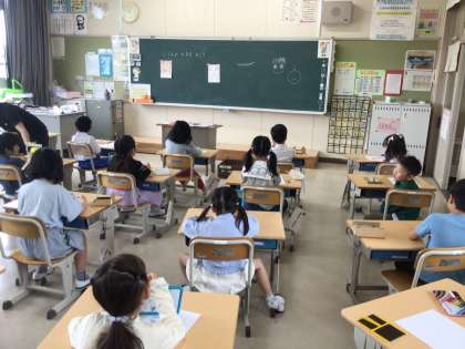 1の2 図工かな。 鏡を見て自分の顔を描こう。 クレヨンで描いています。 自分の顔はどんな顔?