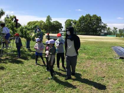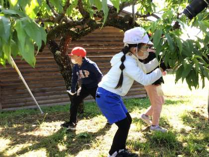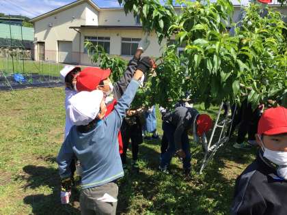 3年生 桃の摘果だよ。 今年も森さんが桃の先生です。 よろしお願いします。