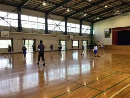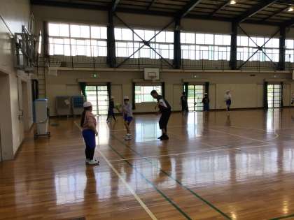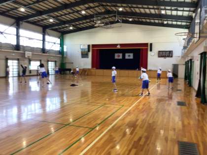 6の2 体育です。 ボールの投げ方。 腕と反対の足を前に出して! 斜め上にね。