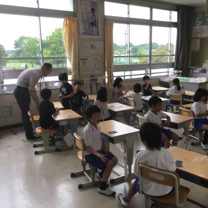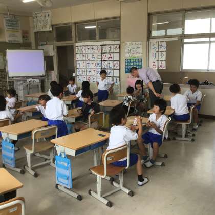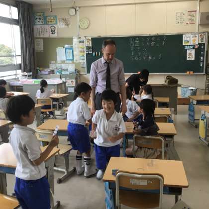 5月31日 その1 公開日 2024/05/31 更新日 2024/05/31 校長室から 1の2 ブライアン先生が来てくれたよ。 ロック シザーズ ペイパー ジャンケンポン! 勝った方からトランプのカード1枚ゲット! カードの数を英語で言いますよ。 数の大きい方が勝ち! 校長 1年