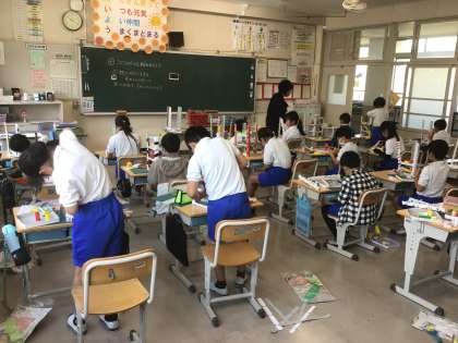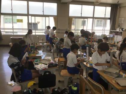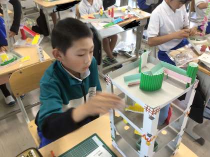 4の1 図工です。 コロコロガーレ 柱を組み立てているよ。 3階建て? 没頭!