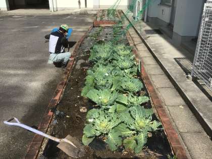 6月17日 その1 公開日 2024/06/17 更新日 2024/06/17 校長室から モンシロチョウ乱舞 3年生理科のモンシロチョウの学習のためにつくっていたキャベツ。 アオムシがしっかり食べて穴だらけ。 サナギから帰ったモンシロチョウの成虫がキャベツ畑にいっぱい! 見えますか? 校長 3年 特別支援学級