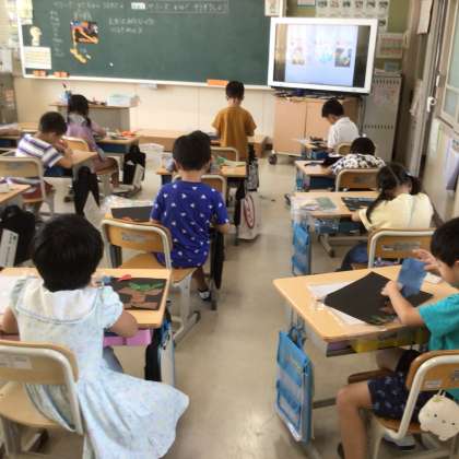 1の2 図工です。 やぶった紙で想像! 何をイメージするのかな?